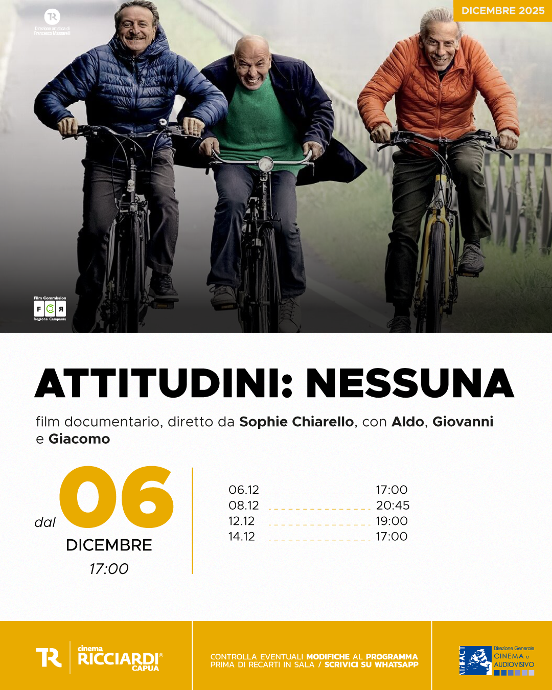 Attitudini: Nessuna, film diretto da Sophie Chiarello, è un documentario sul trio comico, formato Aldo Baglio, Giovanni Storti e Giacomo Poretti, in arte Aldo, Giovanni e Giacomo, icone della commedia italiana contemporanea, che con i loro film e i loro spettacoli teatrali hanno divertito gli italiani negli ultimi tre decenni.