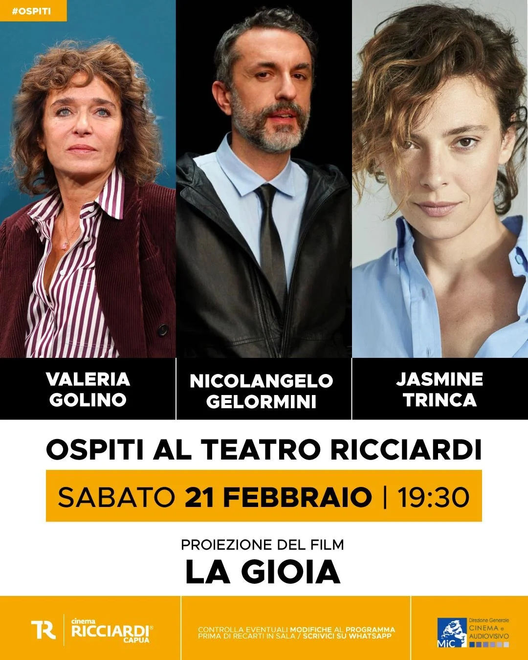Le attrici Valeria Golino e Jasmine Trinca ed il regista Nicolangelo Gelormini saranno ospiti del Teatro Ricciardi sabato 21 febbraio alle ore 19.30 in occasione della presentazione del film La gioia, presentato a Venezia nella sezione Giornate degli Autori.